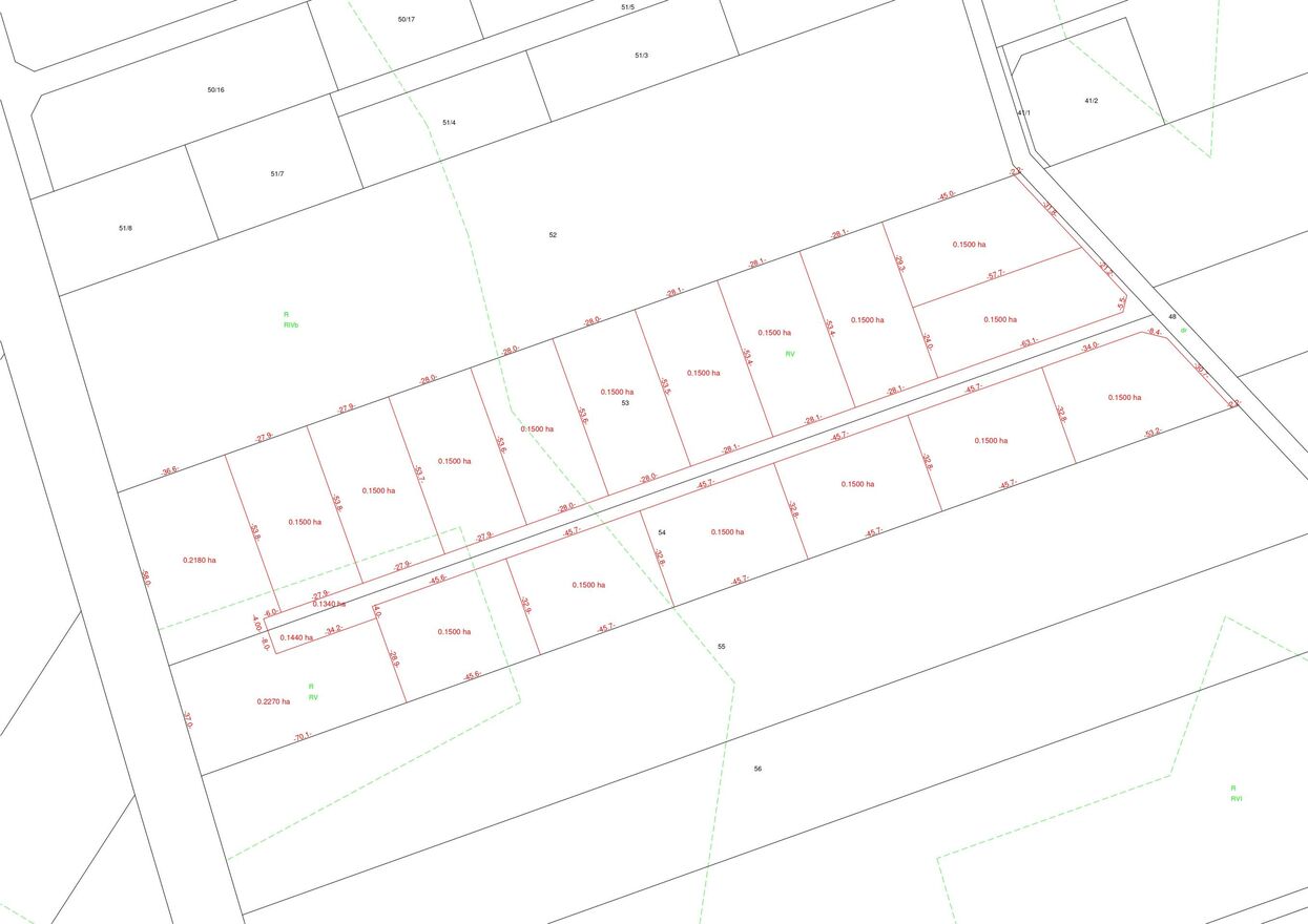Działki w kształcie prostokąta o wymiarach 28 x 53 metra.